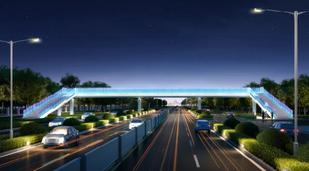 飞跃路人行天桥采用钢结构技术,施工期间受气候及人为影响较小,有效缩短施工周期约20天。同时钢箱梁结构的强度较高,全寿命周期成本更低,生产及施工过程中更加节能环保。
